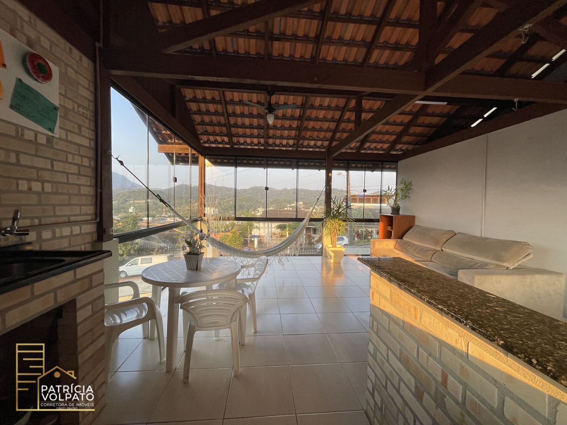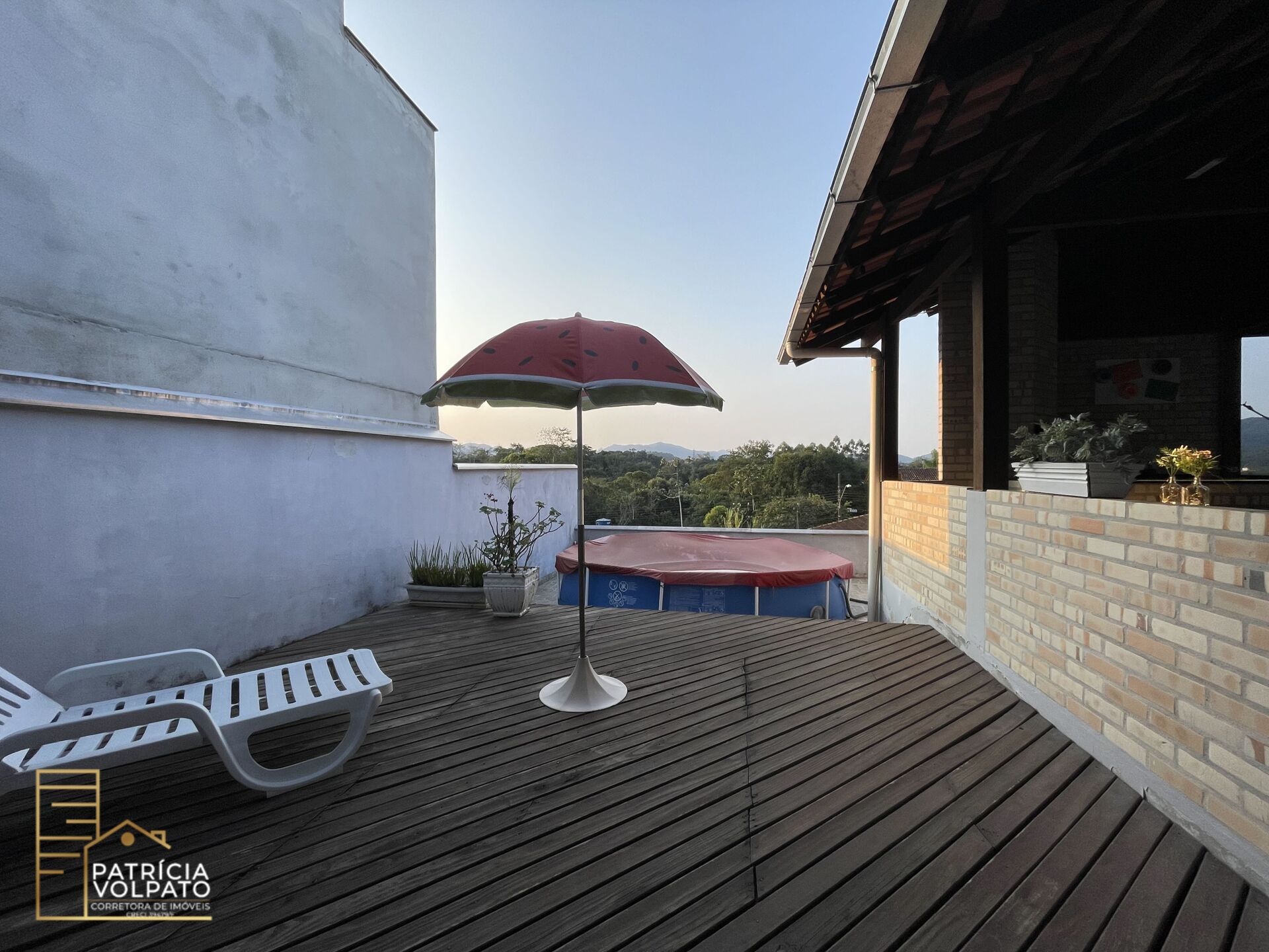 Area de festas com churrasqueira à carvão e uma vista linda, ao lado área de deck para piscina.
